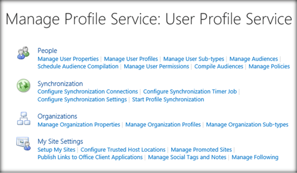 SharePoint has a user profile Service, which is responsible for the administration of the user profiles within SharePoint. The User Profile Service Application is the Service Application, which forms the basis of the user profile Service. All the social features of SharePoint are directly dependent on the User Profile Service, as it uses it to retrieve the user information. The social features like My Sites, Self-Service Site Creation, news feeds etc. requires the user profile Service to be pre-configured. Moreover, user profile Service Application is responsible for synchronizing the user profiles with the information which is stored in the active directory services.