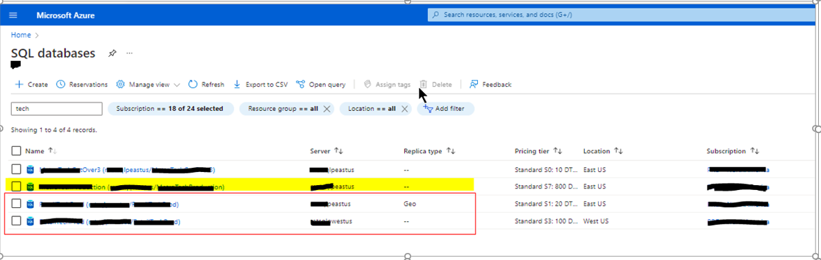 Every production database should have a geo-replica of the same name. In the Azure Portal, SQL Databases, the DB used for production will have a blank "replica type" where the replica DB will have replica type "Geo." Note in the screenshot below that the two DBs inside the red rectangle are a paired primary DB and its geo-replica. The highlighted production DB was recently created and lacks a geo-replica.