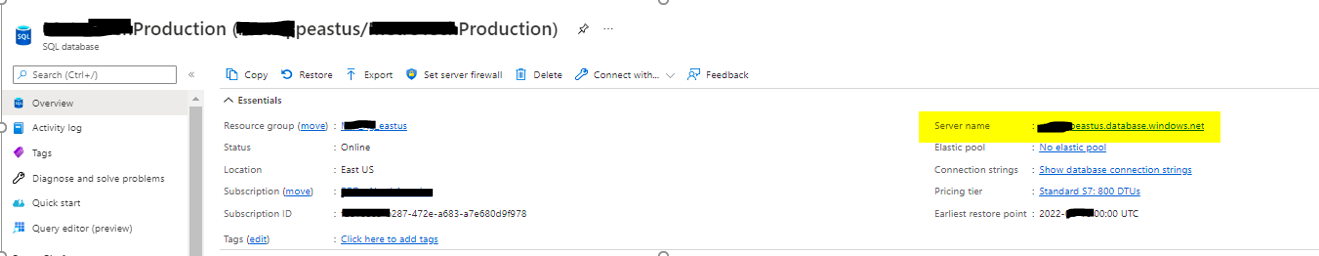 - Open the DB that has no replica, so that we can create one. Click on the "Server name" hyperlink to go to the SQL Servers module.