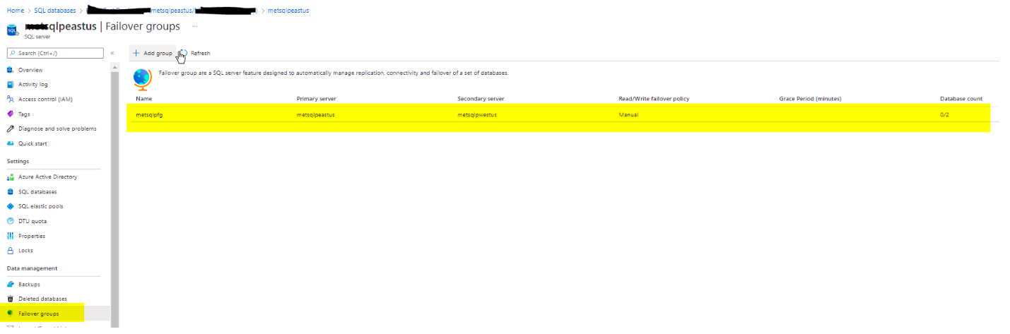- On the DB Server, select the "Failover groups" blade. This failover group was created, but has not yet been configured. Note the last column, "database count" shows "0/2" meaning no DBs have been set up for failover.