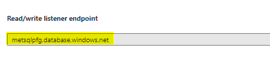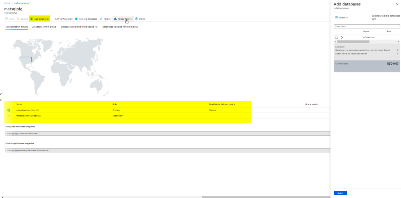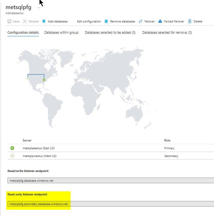 - Note the "Read/write listener endpoint" below the map. This is the FQDN referring to the failover group