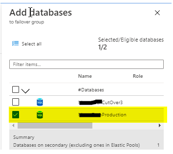 - In the "Add databases" dialog, select only the production DB which will be the primary. Click Select at the bottom to save it.