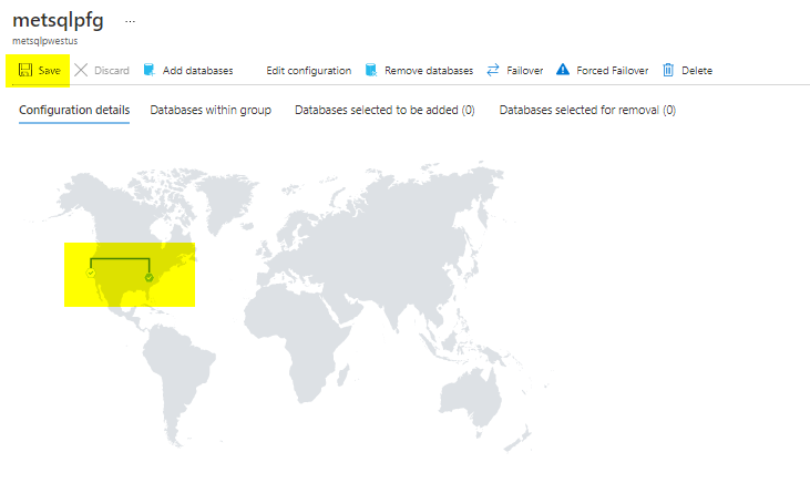 - On the Map page, click Save to begin the deployment. A geo-replicated database of the same name and size will be created in the SQL Server in the paired Azure location. This is depicted on the map by an animated dotted line between locations. When the line turns solid blue, the replication has completed.