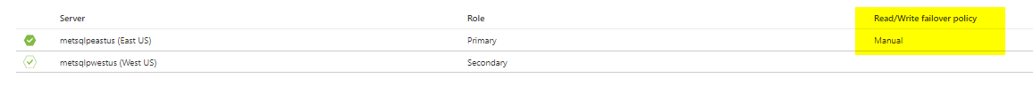 Note the "Read/Write failover policy" is set to "Manual." This means that in the event of a failure of the primary database, an Azure administrator with Owner access must trigger "failover," making the secondary database become the primary.