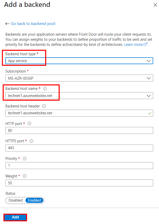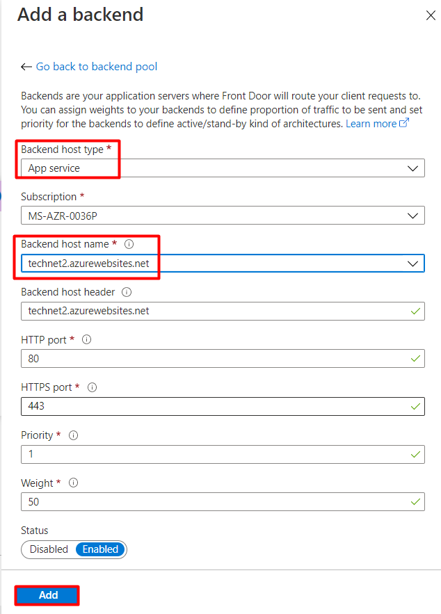 - Backend hostname: Select the first web app you created. In this demo, our App was technet2.