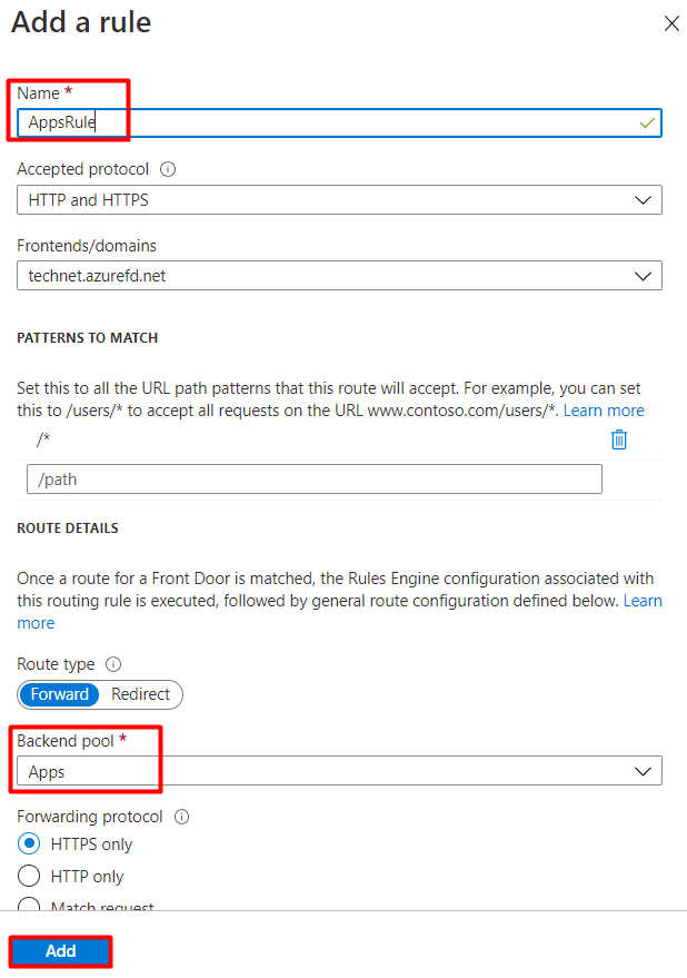In Add a rule, enter the Name for the rule, make sure that the Backend pool is App, and leave all default values, and Add the Rule, finally Select Review + Create, and then Create.