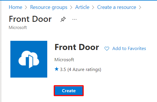 On the Azure Portal, go to search resources, and type front door, and then select Front Door.