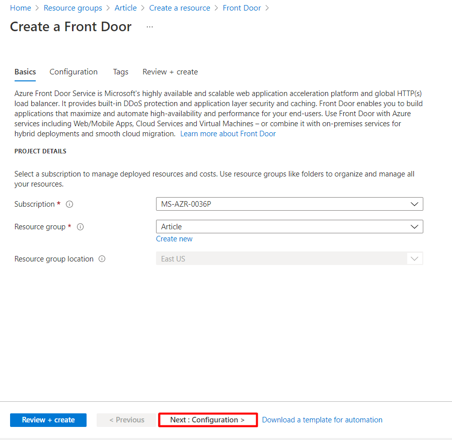 On the Create a Front Door tab, select your subscription, Resource group, accept the default location setting, and click Next: Configuration.