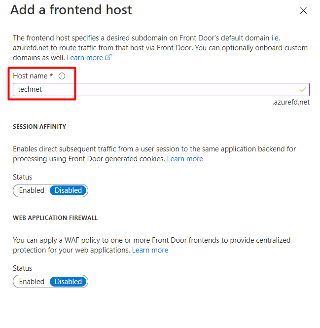 On the Configuration tab, in Frontends/domains, select + to add a frontend host.