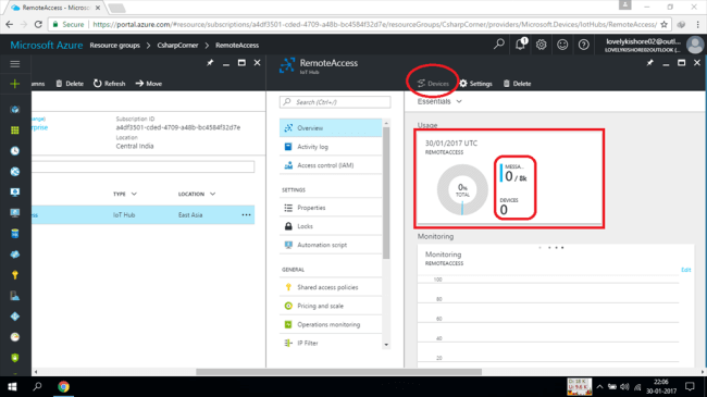 Again, open your portal and go to IoT hub Service, which you have created previously. In the beginning of this article, I have shown in a screenshot that there are no devices found in the hub. I have marked it in the screenshot. Have a look over it again, if you don’t remember. Since we have provisioned our device now, the device is already configured in IoT hub Service. You can have a look over the screenshot below to find the change. Now, if you click on the devices option in the top, you can see the set of all devices which you have connected. Since you have connected one device now, you will see only one. The usage meter given below will measure the amount of data, which is sent and received. You can find the connection string from the device option too.