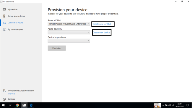 You can now even create a new IoT hub from this Window. Since we already created the IoT hub, we can make use of the same. Now, we need to create a new device ID, which will be stored in IoT hub of Azure. This will help Azure to access your device and to store the data of it in a separate directory. To create a new device ID, click on the Create new device option. Once you click on it, you will be asked to enter a new name for the device. Give some name by which you would like to register your device in Azure IoT hub and click 'Create' button.