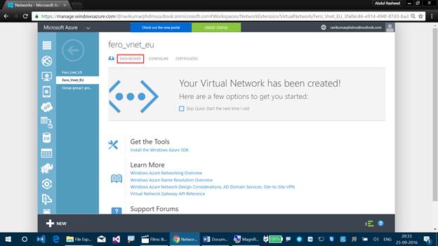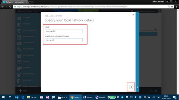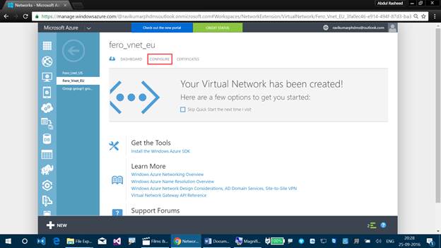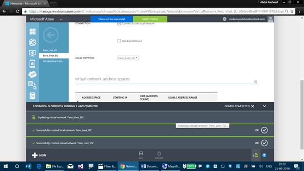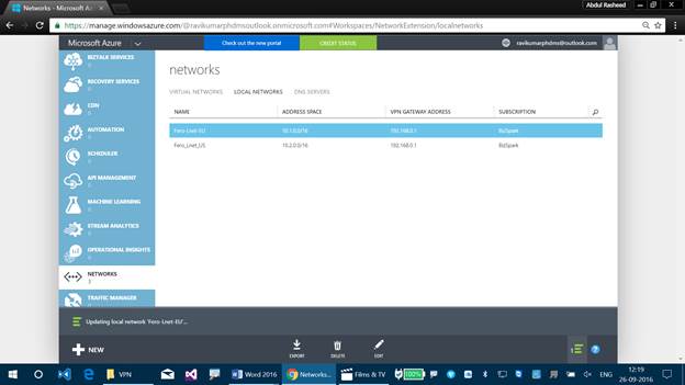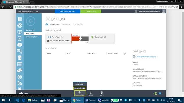 Follow my next article to work on configuring the US v-net site-to-site connectivity, create the VPN gateway for the US v-net, set the VPN IP address in the US local network configuration, set the v-net VPN gateway keys, and check the VPN Connectivity.