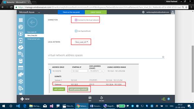 Check in with the “Connect to the local network”. Select the Local network (Fero_Lnet_US) and add a gateway subnet.