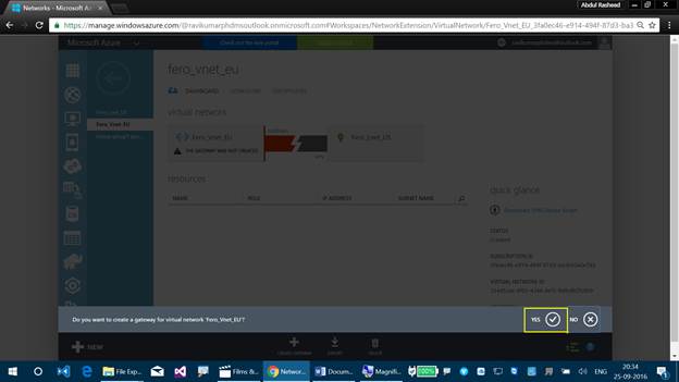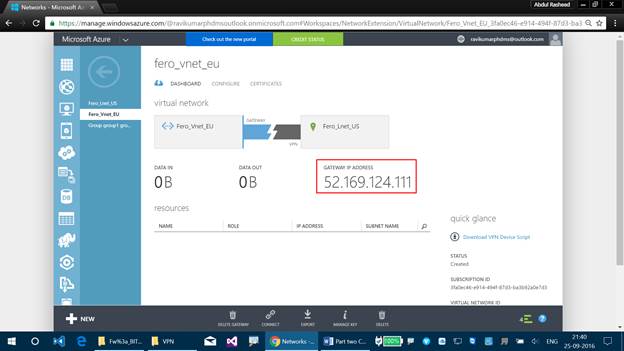 Here, you can find the Gateway IP address for “fero_vnet_eu”. Gateway IP address: 52.169.124.111