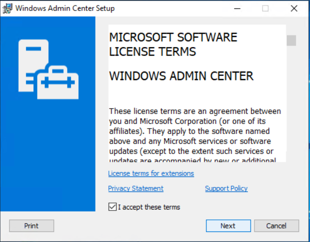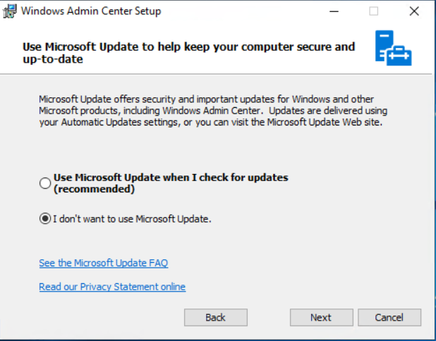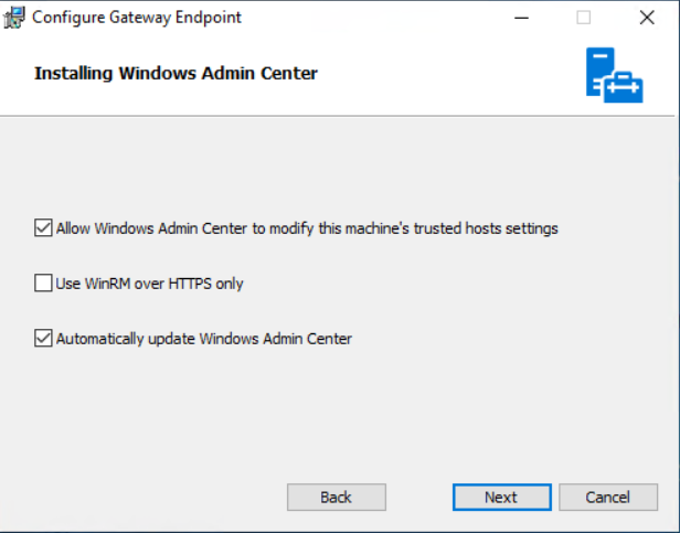 In the Installing Windows Admin Center, select Allow Windows Admin center to modify this machine, and Automatically update Windows Admin center; click Next.