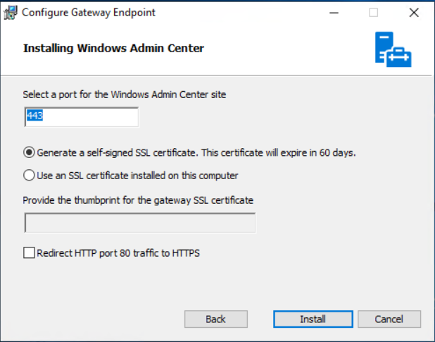 Select a port 443, and if we have our certificate so we can use it; otherwise, we can select Generate a self-signed SSL certificate and click Install.