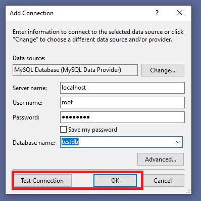 I’ve put in my Server name which is “localhost”, a User name that is “root” and my password. Remember, above we made the Database TestDB for this very experiment. Here, we can use the lowercase name “testdb”.