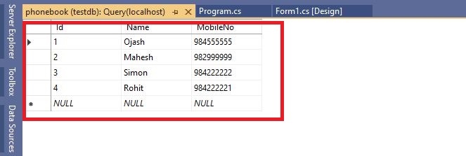 When we reload, we can see the NULL has now changed to numerous data on Id, Name, and MobileNo in the phonebook.