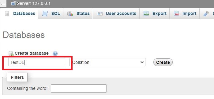Now, Under Create Database, Type the name of the new database we are going to create.