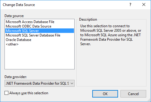 First, you need to choose the type of database to which you want to connect. MS SQL Server is pre-selected.