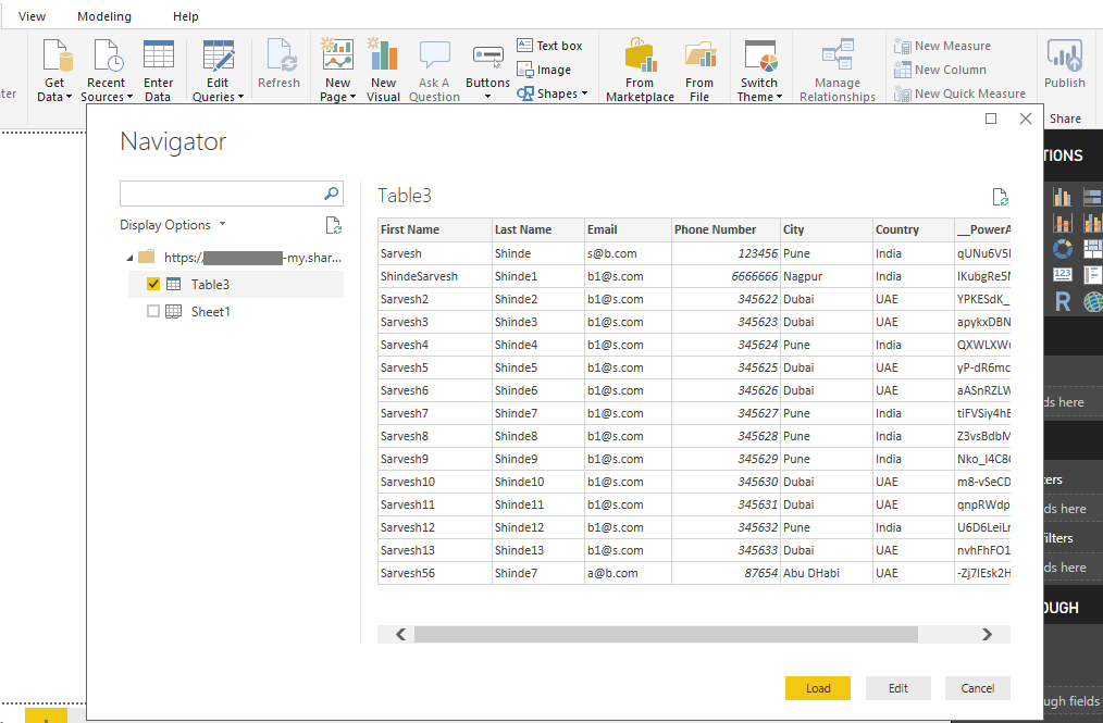 Now click on Connect to proceed further >> You should see tables and sheets from your excel file on the left side panel and once you choose one of the entities you should see your data. Go ahead and click on Load if you don’t want to make any changes in the data, or if you want to do data transformation then click on Edit button. Good luck.