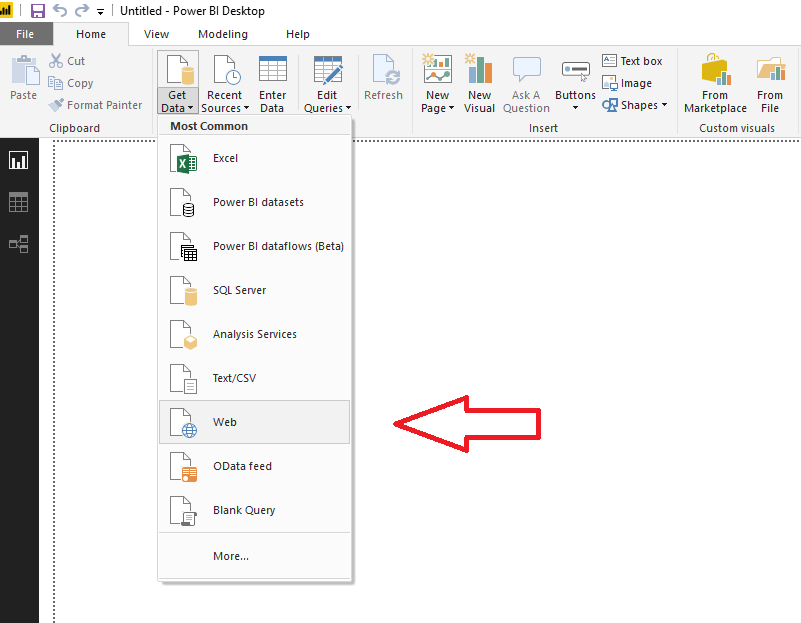 Open your Power BI Desktop application. We will be using Web data source option; so, from the "Get Data" menu, select Web option.
