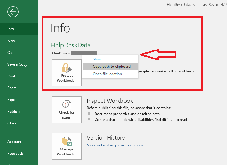 Once opened, click on Info tab >> Below the name of the Excel file, you will find a link “OneDrive - …” click on that link as shown in the below screen. Then, click on "Copy path to clipboard". This will copy the OneDrive path of the Excel file. Keep it handy.