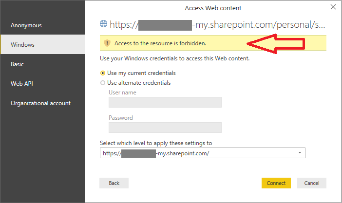 Next screen is authentication window >> if you keep trying windows, basic or anonymous, you will get an error. So, do not try any of these methods.
