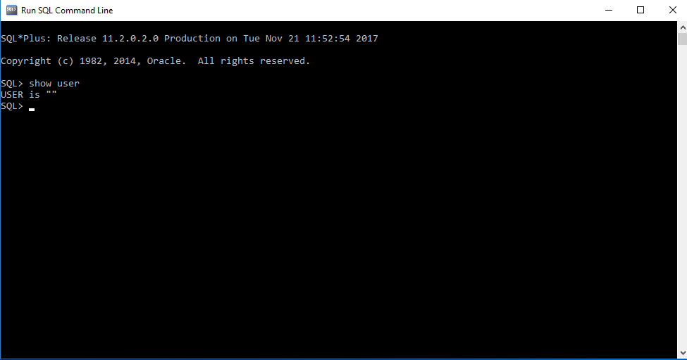 SQL command line looks something like the below picture. There you can type the commands for execution. For starting purpose, I have typed the command show user which will list me the common user. Here it shows the user with double quotes.