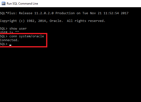 Now it's time to connect the user. By default, it is a system and while installation of ORACLE, I have given the password as oracle. The below command shows how to connect with default user with password.