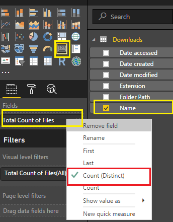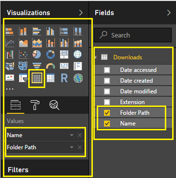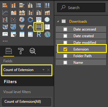 I want to show file count by extension. So, I will use the table visual.