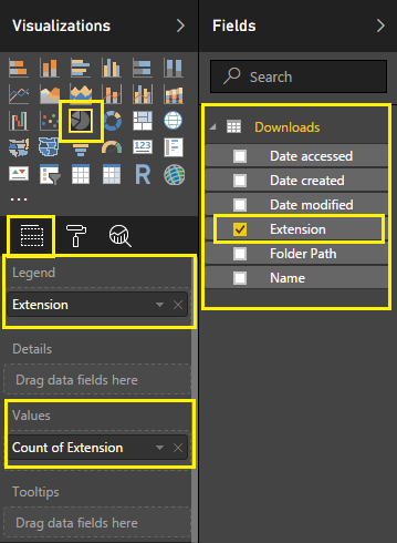 Now, I want to represent the file count by extension in a graphical form with a pie chart. So, I will add a Pie chart and add the following columns.
