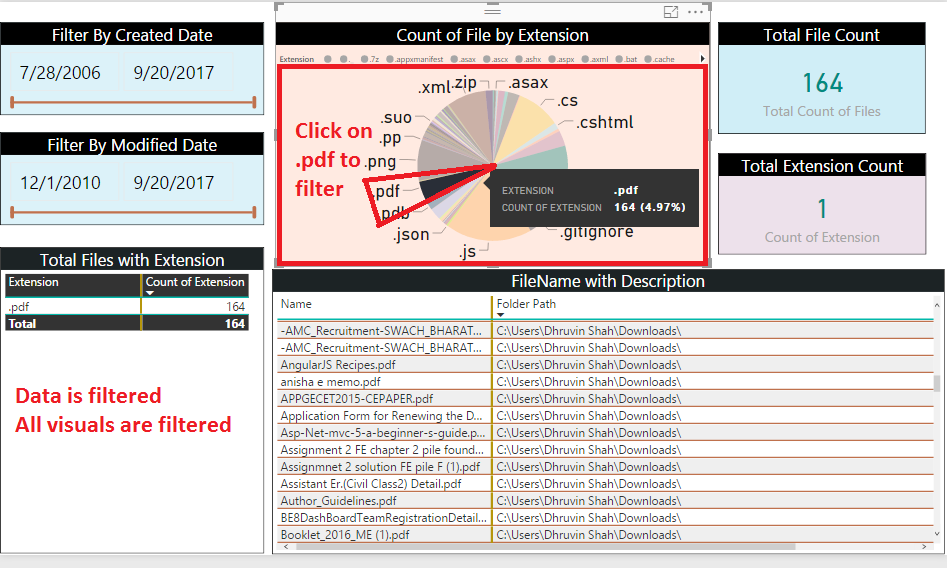 Now, let’s filter based on file extension. I want to see the list of .pdf files only. I will select .pdf extension from pie chart.