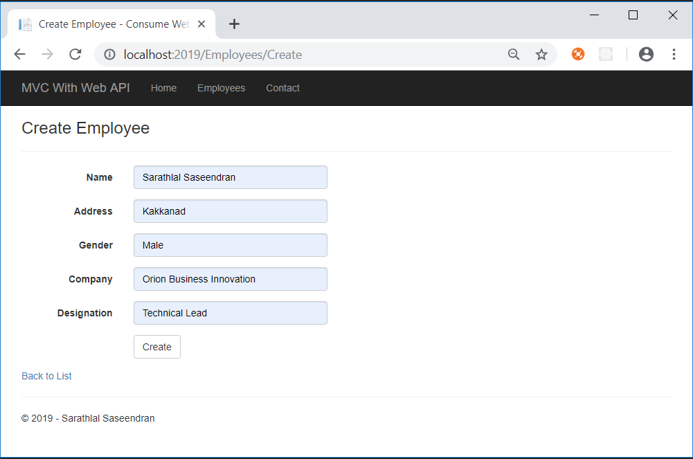 In this post, we have created a Web API using Entity Framework and repository patterns and later we created an MVC controller and views using scaffolding template and consumed the Web API in MVC controller. We have seen all CRUD actions with this employee application.