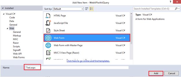 I need to add a web form now for the jQuery code, so right click on the project and add a new item.