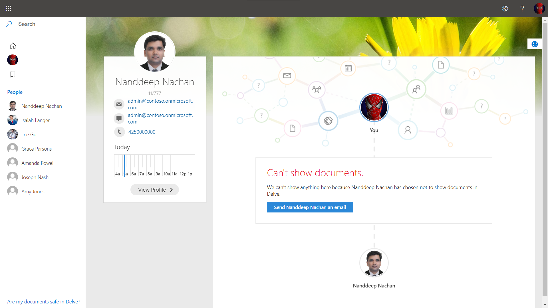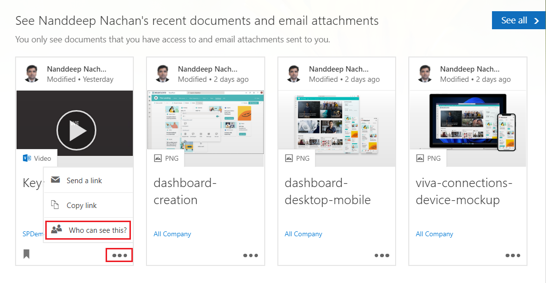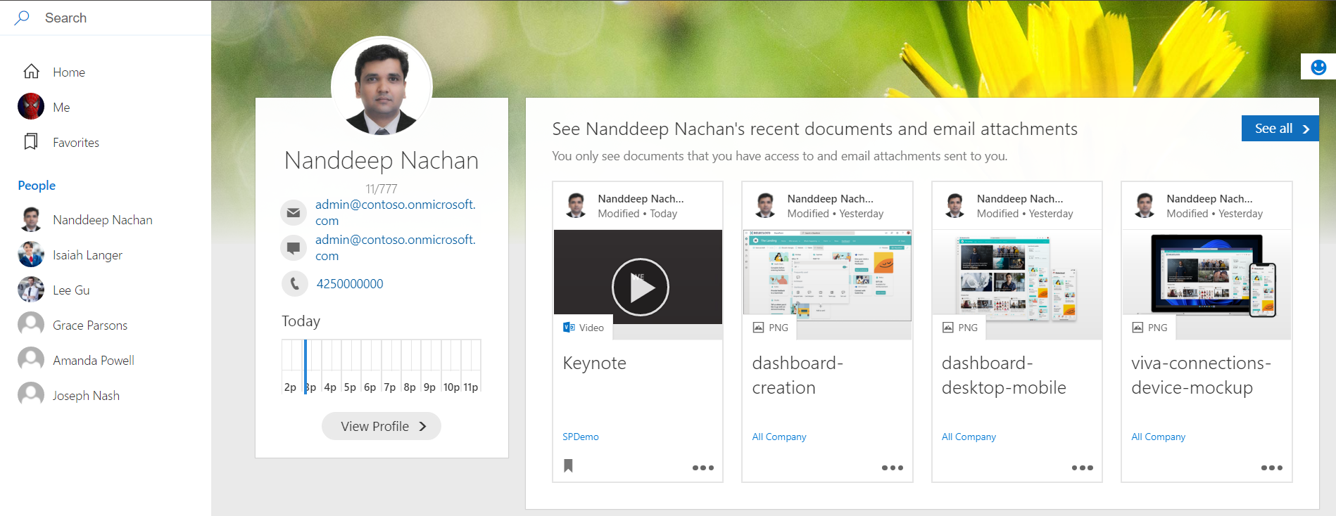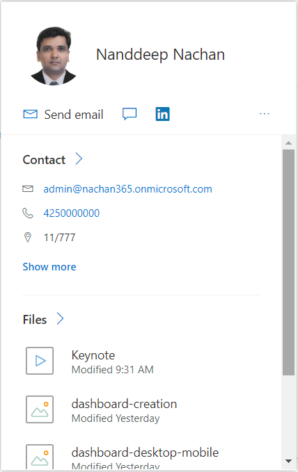 When you mouse hover a user in Microsoft 365 Apps (including SharePoint, Yammer, and MS Teams), it shows the user profile card as follows along with the files related to a user.