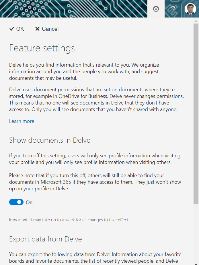 Delve is your user profile in Microsoft 365. It shows your profile information along with files you are working on or have shared with a user. If you want to hide the files to appear in your Delve profile, consider making these changes. However, note that these settings apply only to Delve and will not hide the files to appear for your colleagues on other apps and search results.