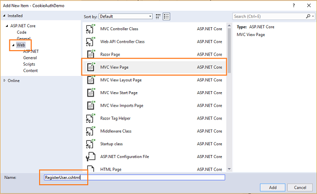 An “Add New Item” dialog box will open. Select Web from the left panel, then select “MVC View Page” from templates panel, and put the name as RegisterUser.cshtml. Press OK.