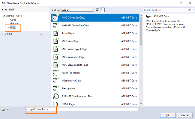 An “Add New Item” dialog box will open. Select Web from the left panel, then select “MVC Controller Class” from templates panel, and put the name as LoginController.cs. Press OK. This controller will handle the logic for Registering new user and login into the application.