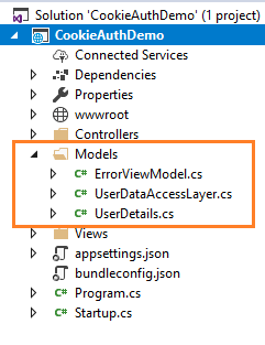 Right click on Models folder and select Add >> Class. Name your class UserDetails.cs. This class will contain our User model properties. Add one more class file to Models folder. Name it as UserDetailsDataAccessLayer.cs . This class will contain our Database related operations.