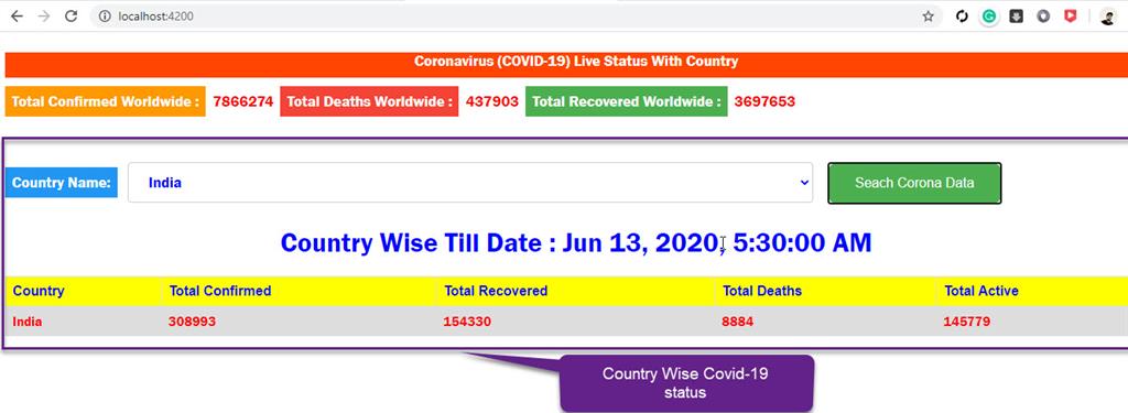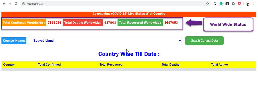 The landing page of Covid-19 live status using Angular is shown as mentioned below,