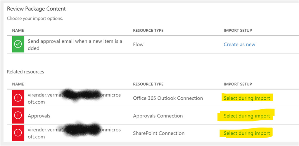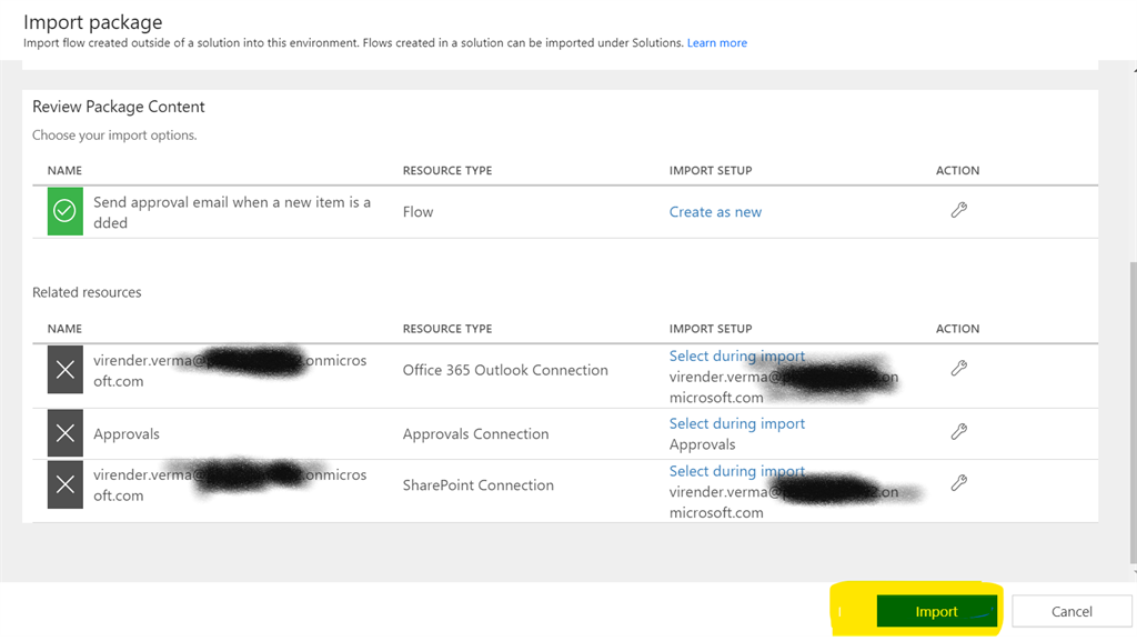 Please note that under “Import setup” field we have “Select during import”. This option is because during export we selected this option, as all these resources have to be revisited when we are importing the power automate in destination environment. In my example I have used “Approvals”, “Office 365 Outlook” and “SharePoint” resources in my power automate. The real meaning for this settings option is that URLs and other properties of these resources are to be changed when we move to another environment