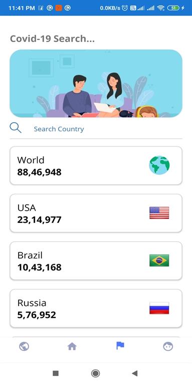 In this Covid19 Search Countries page, we add one ListView and show the all the country COVID cases data Like INDIA and USA, and UAE.