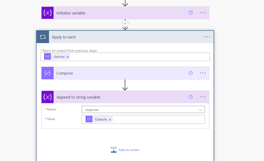 - Add the "Apply to each " - Post a message (V3)" action: Once you receive the response from the ChatGPT API, you can use the "append Variable- Post a message (V3)" action to send the response message back to the PowerApps.