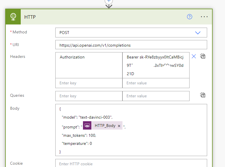 - Add the "HTTP" action: In the Power Automate flow, configure a new "HTTP" action to send a POST request to your ChatGPT API endpoint. You must provide the message text from the Teams channel as a parameter in the request body.