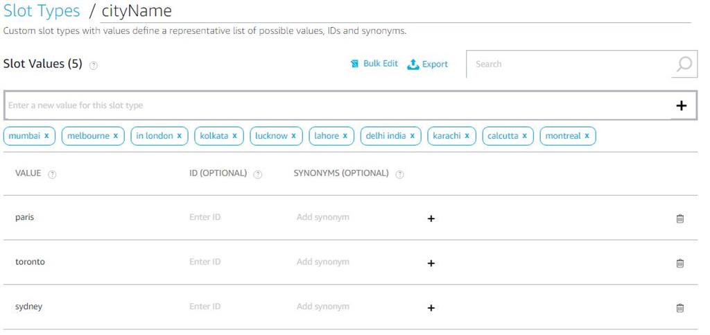 Different slot values are defined such as Paris, Toronto, Sydney, etc.