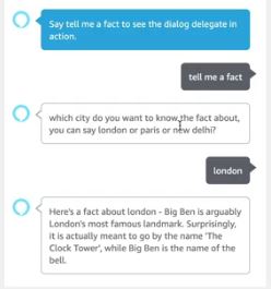 With the help of LaunchRequestHandler, Alexa greets the user and says “Say tell me a fact to see the dialog delegate in action”. It asks the user to say “tell me a fact”. The user can ask for details of any city by making utterances such as “tell me a fact about New Delhi”.