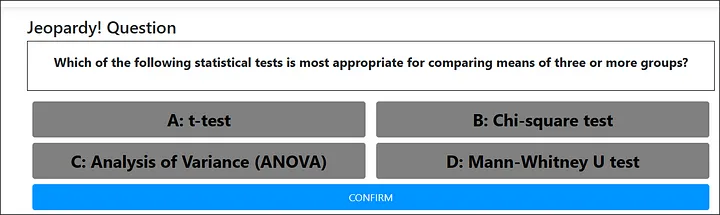 The game presents a question along with four possible answers. The player selects one answer, clicks ‘confirm’, and the webpage then indicates whether the selected answer is correct or not. Below is the code that powers this functionality.”
