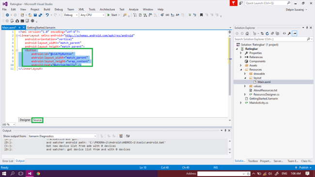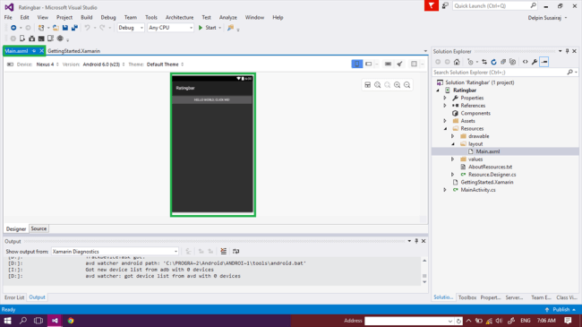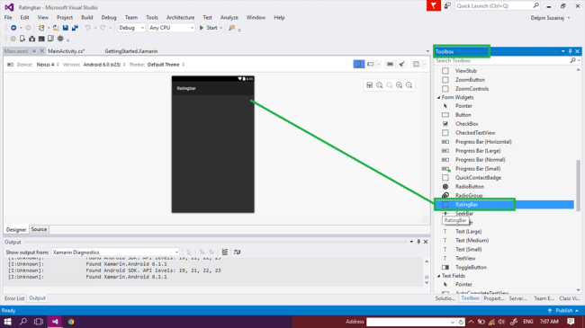Drag and drop the Rating Bar control in your Main.axml page wherever you want.