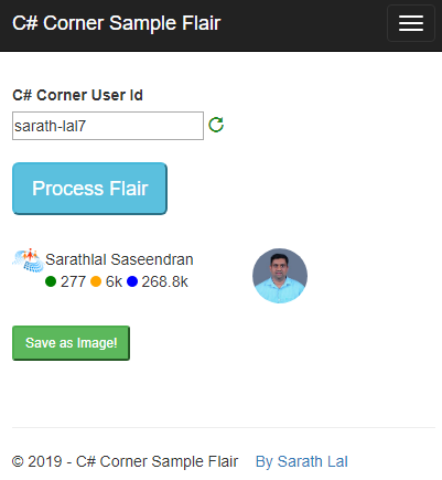In this post, we have seen how to scrape data from C# Corner profile page for a user and get details like name, user rank, user reputation and user image. We have created a user flair using this data. For that, we used HtmlAgilityPack. We have also provided an option to save the user flair as an image. For that, we used a third-party JavaScript library html2canvas for this.